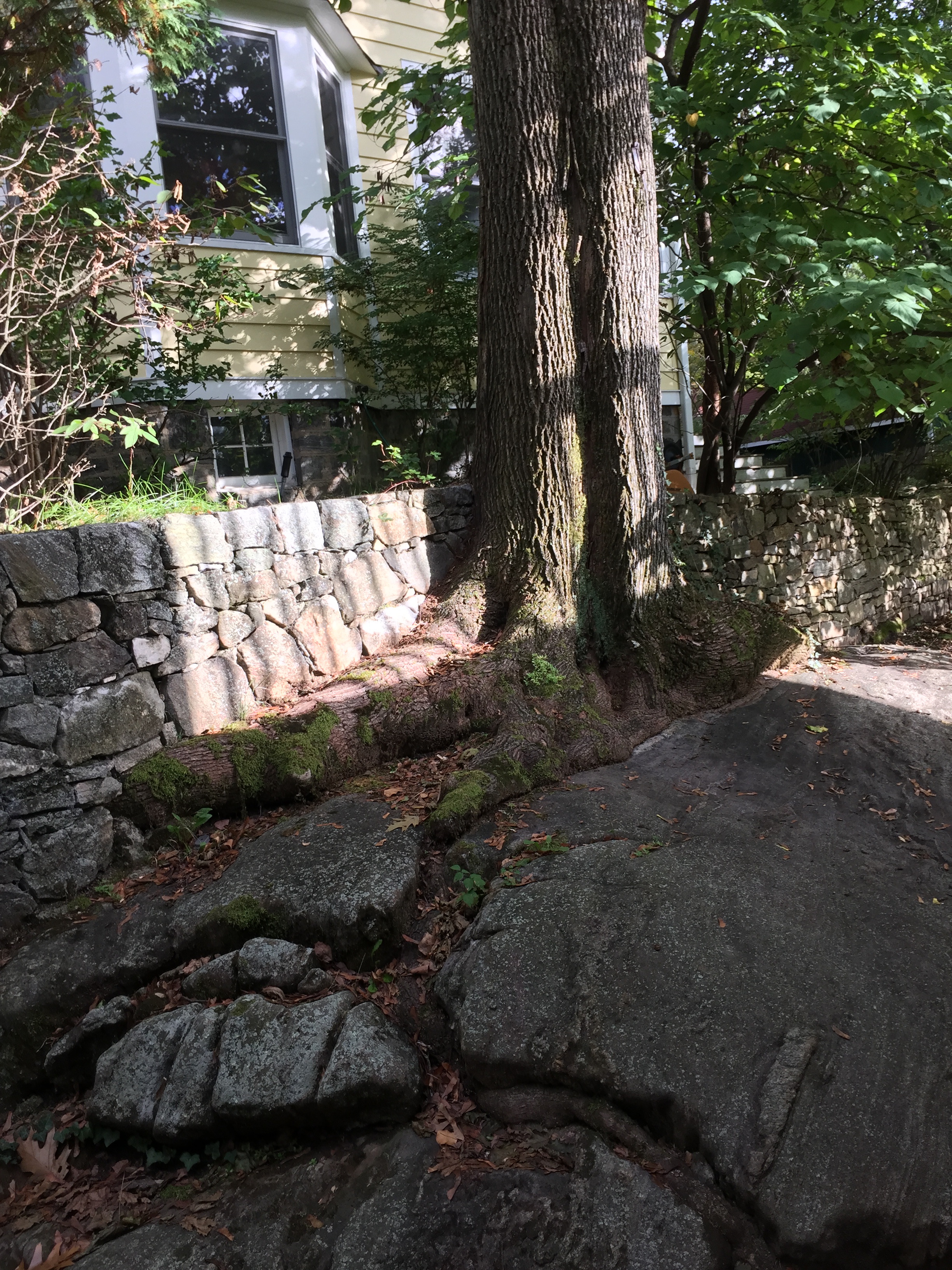 A mammoth Norway Maple probably 70 feet tall and more than 75 years old, it had grown into the wall behind it and onto the bulging bedrock below it like a barnacle. It looked as if its roots had nothing but rock as a base, no soil. Of course trees the world over grow in stone. Georgia’s Stone Mountain is home to trees for which life would seem improbable.