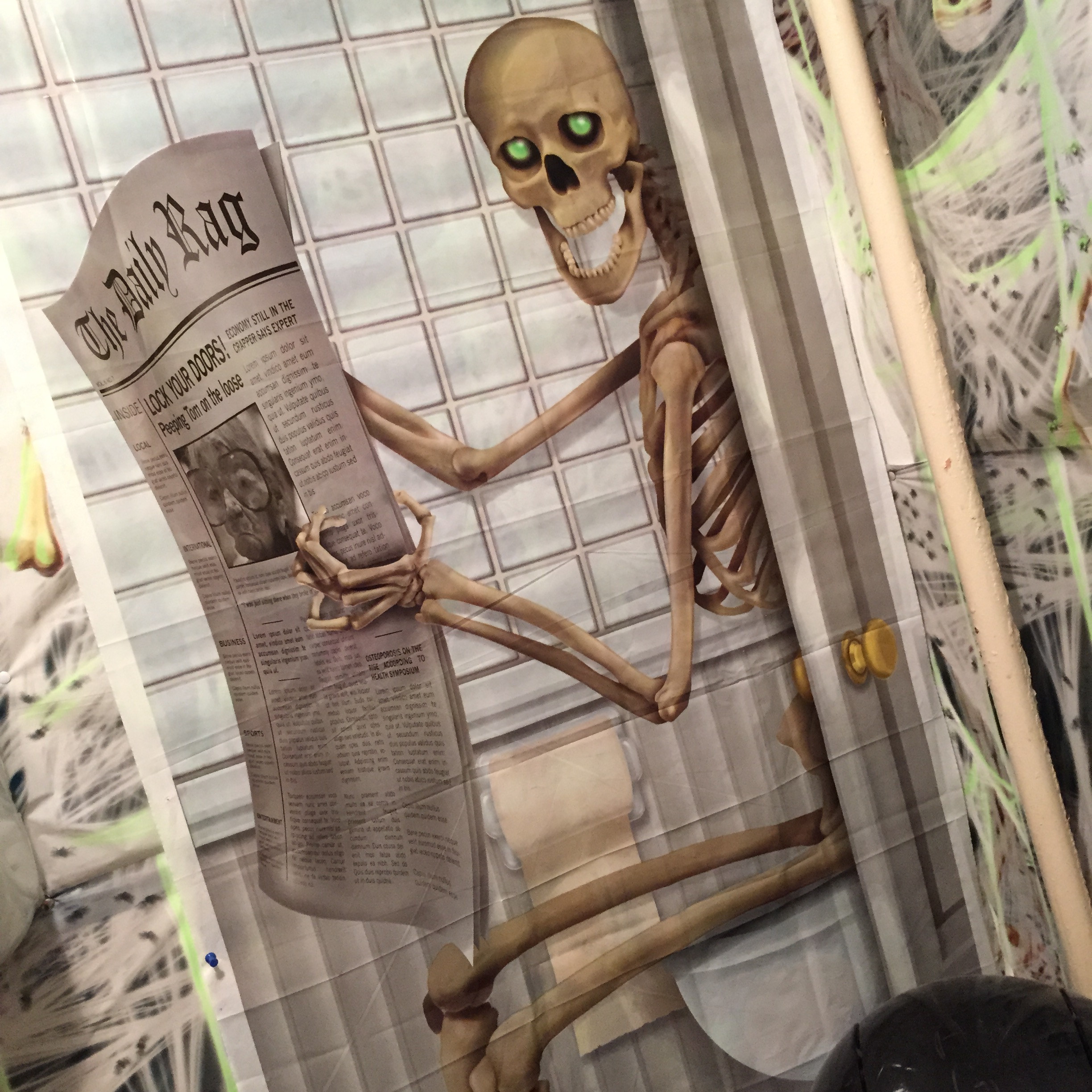 The woman had even decorated the bathroom, so that when you turned to the side this skeleton is what you would see. Giving the paying/peeing customer a little chuckle.