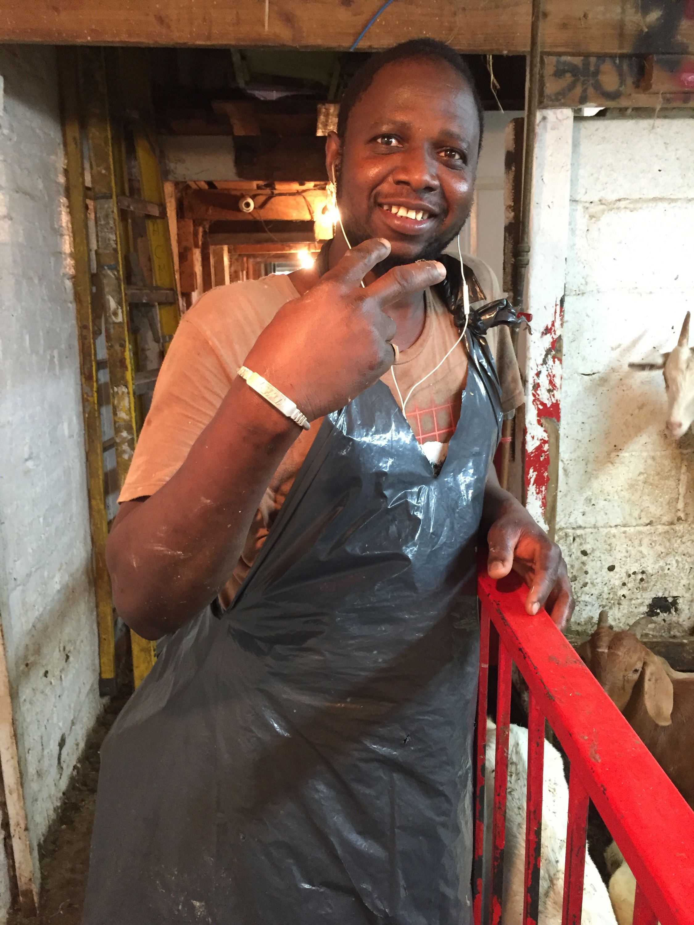 I have always liked goats, their infernal eyes, their randy temperaments. These were going to die. I had my eye on a little brown one hunkered down in a corner. “That one’s seven months old,” said Muhammad, who works there not killing chickens, he told me, but eviscerating them. He wants to get another job, he said.