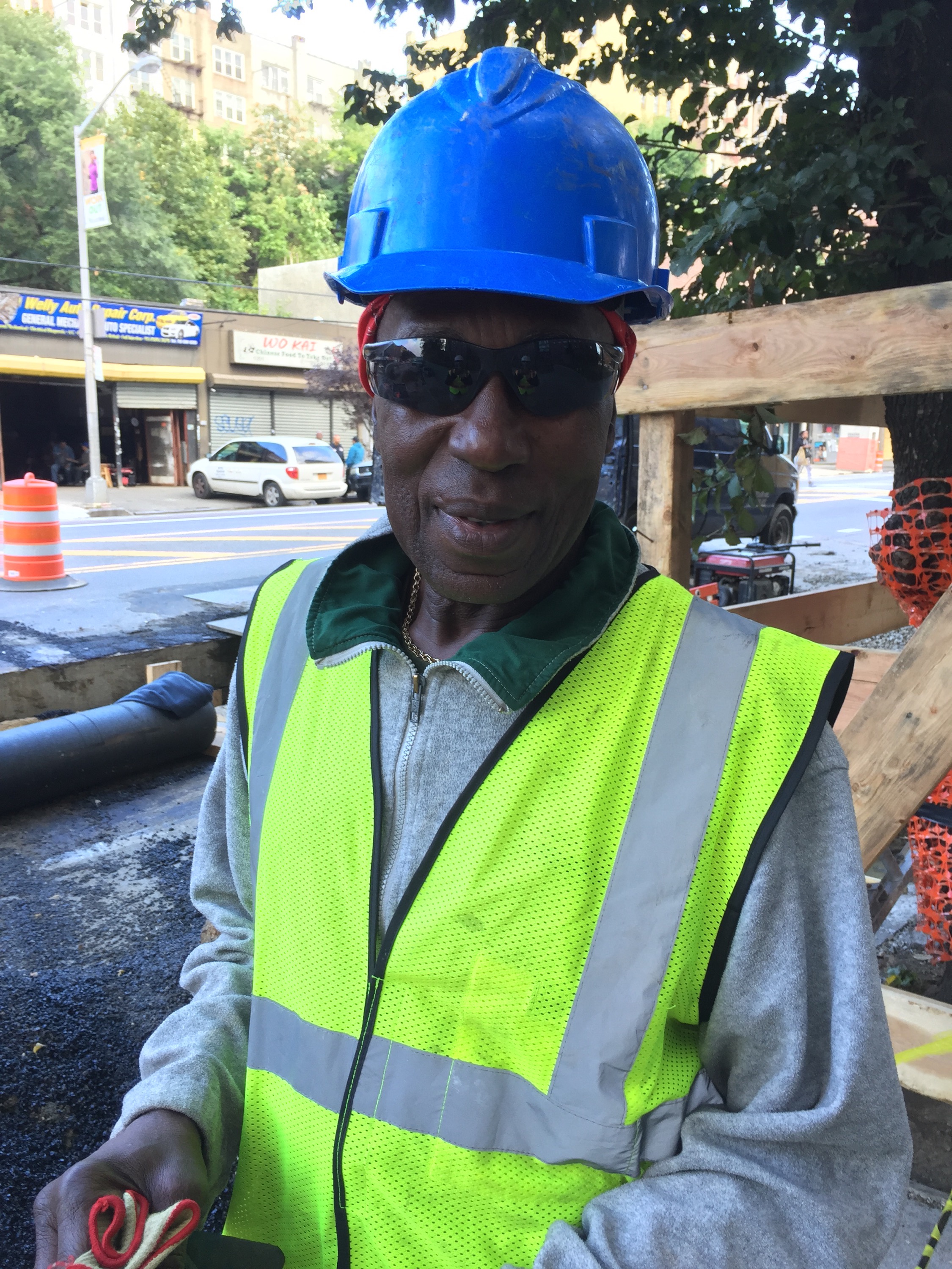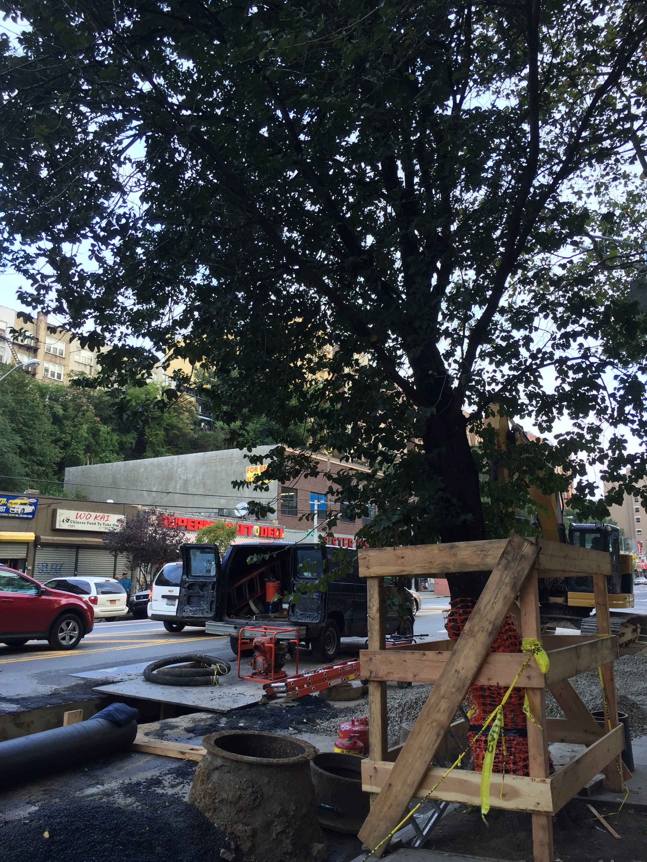 Dogs run unfettered here in the South Bronx and they leave their waste on the sidewalks. I saw a pair of boots left out in the trash and they were gone 10 minutes later. The backhoe brushes and bruises the low hanging branches of the Elms. The work: slow. The inspectors stand at the edge of the pit and stare in moodily, no one is happy with the pace.