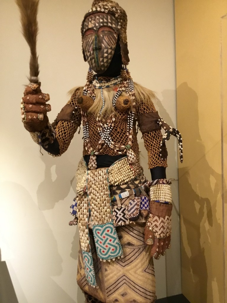 Note the breasts. And I could not help but think that the Congolese women probably play a rather large role in crafting these costumes. The sleeves and torso are woven somehow with a jute-like material; sometimes dyed and fastened with cowrie shells. How did these women make these garments? I wondered. I wanted to see the patterns, the looms. Or was the fiber somehow knitted? The otherwise elaborate placards did not say. I am always interested in how something is made as much as the finished product.