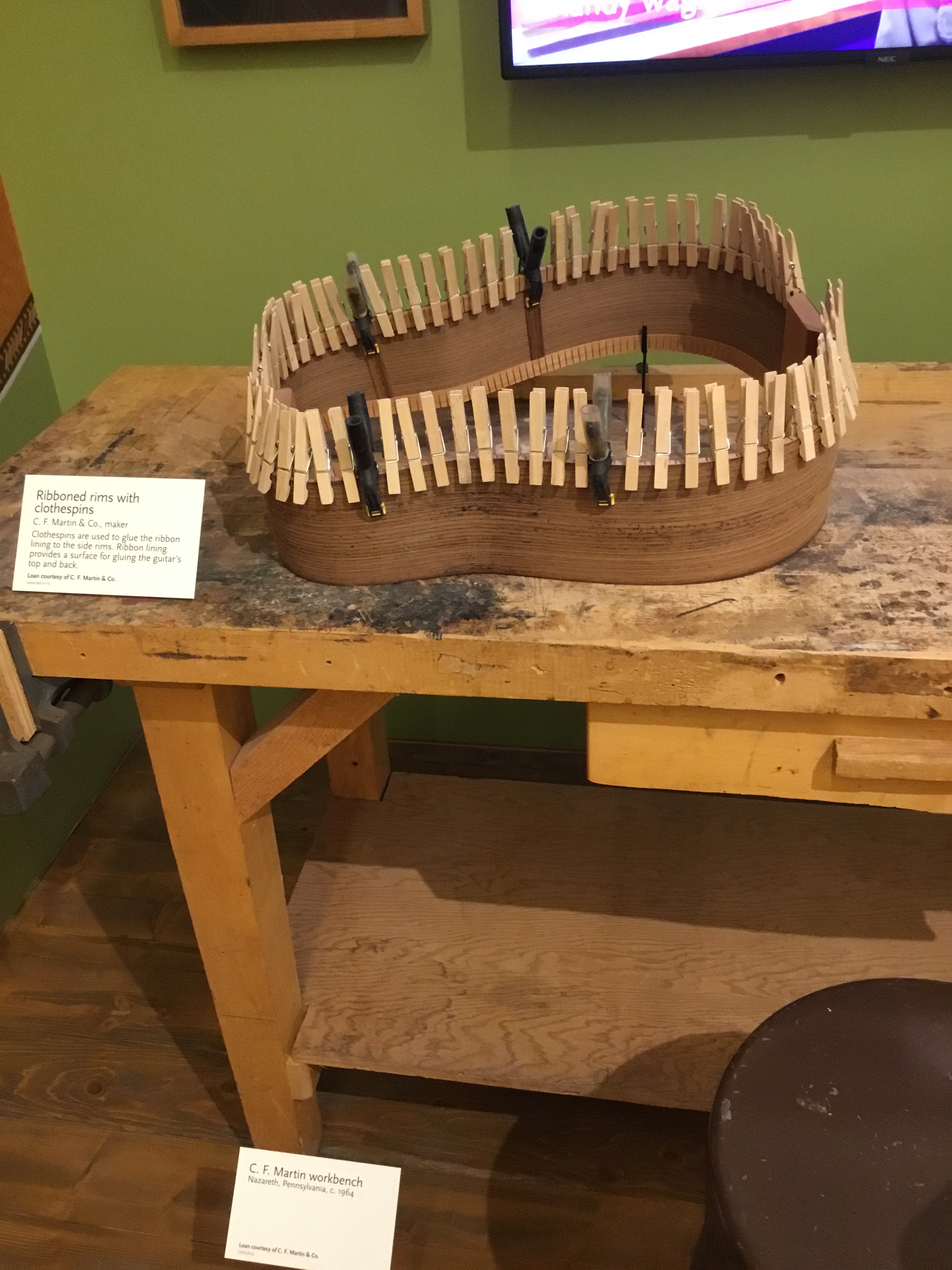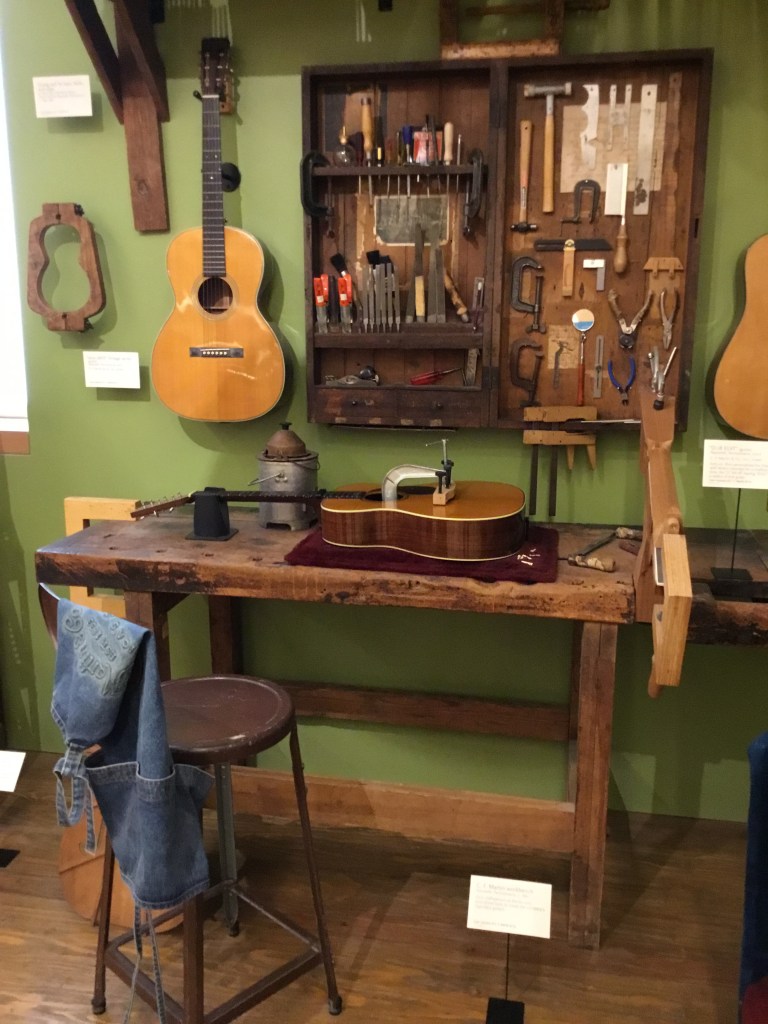 The exhibit I thought really excelled showed a Martin workshop complete with all the tools of the trade. The museum info talked about the development of the Dreadnought guitar, its larger body, wider waist and tapered shoulders, the difference of its frets, how it became the premier guitar in America (Martin helped fund the exhibit.)