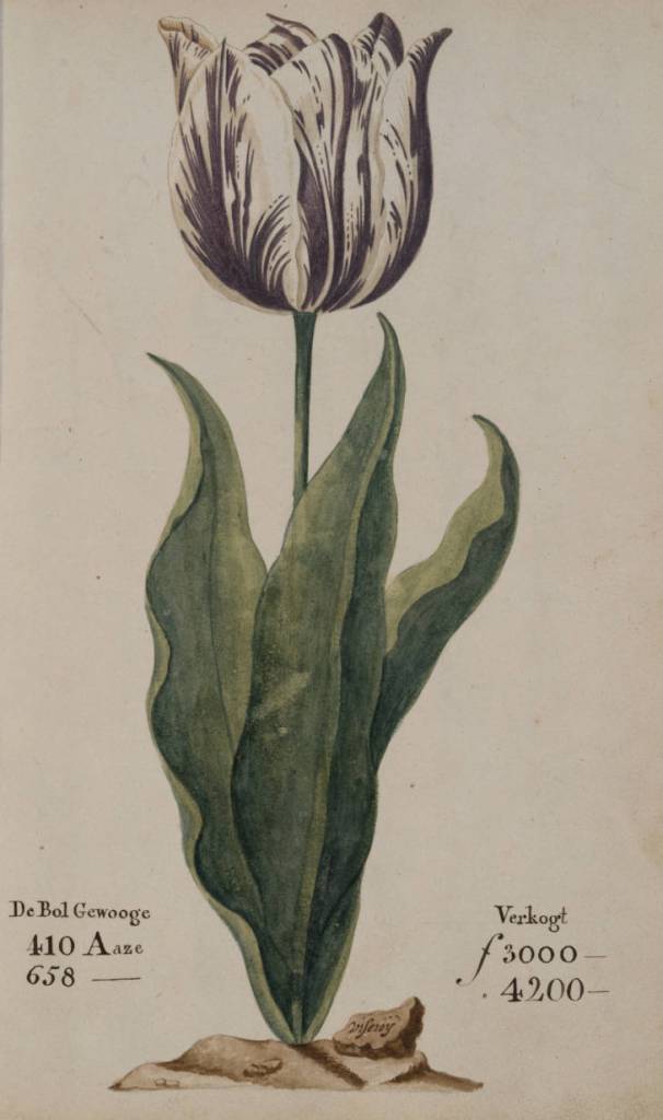 At the peak of tulip mania, in February 1637, some single tulip bulbs sold for more than 10 times the annual income of a skilled artisan. The Intricate stripes we see were caused by a tulip-specific mosaic virus, which could “break” petal color into two or more. Speculators entered the market. The Viceroy was sold for two lasts of wheat, four lasts of rye, four fat oxen, eight fat swine, twelve fat sheep, two hogsheads of wine, four tuns of beer, four tuns of butter, 1,000 pounds of cheese, a complete bed, a suit of clothes and a silver drinking cup.