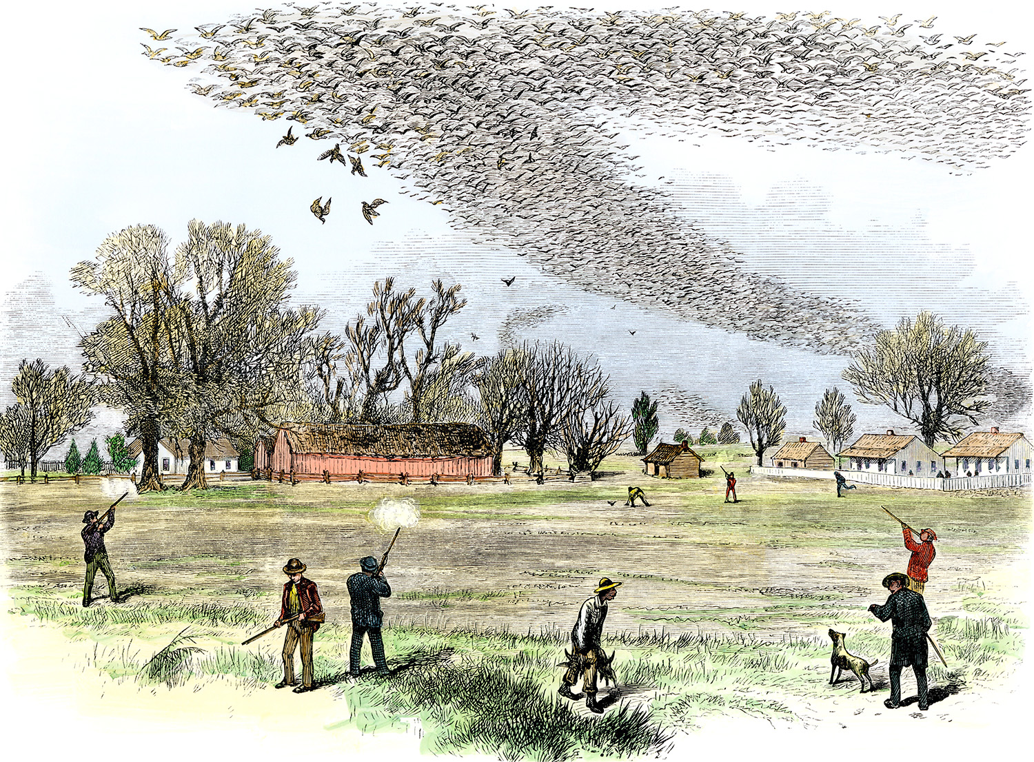 Audubon’s appetites existed on a very small scale compared with Americans’ relationship with the passenger pigeon. Masses of them appeared in the sky and communities would gather to shoot them down. John Muir recalled having “seen flocks streaming south in the fall so large that they were flowing over from horizon to horizon in an almost continuous stream all day long, at the rate of forty or fifty miles an hour, like a mighty river in the sky, widening, contracting, descending like falls and cataracts, and rising suddenly here and there in huge ragged masses like high-plashing spray.”