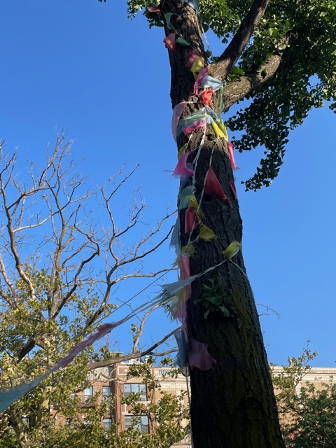 I’ve seen neighborhood people make tree guards a part of their lives, ornamenting them. These ribbons wind up from the tree guard.