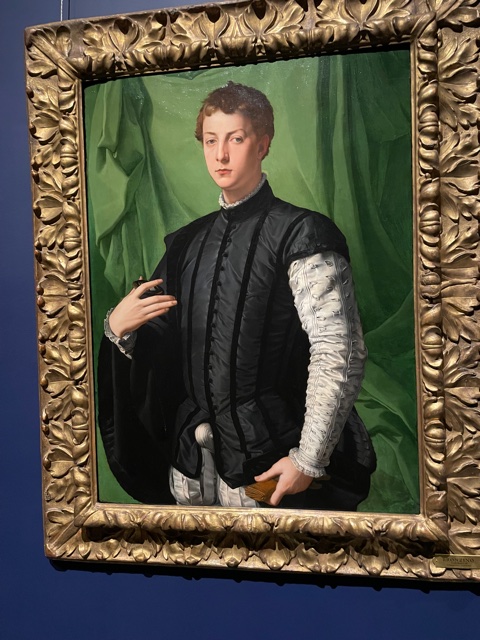 I’ve seen this arrogant young man before, Ludovico Capponi, in the Frick Collection, adorned in a black taffeta jerkin, painted by Bronzino in 1550. He was supposedly quite the ladies man.