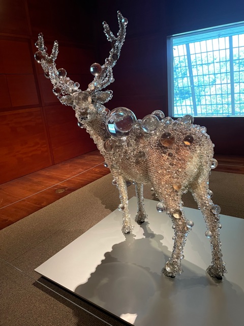 A taxidermied deer adorned with scads of crystal bubbles.