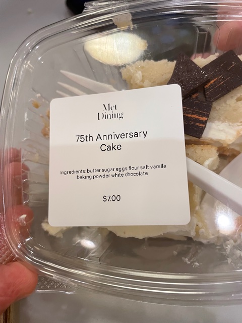 to begin with, roasted, encrusted with falafel and embellished with baby arugula and lemon salsa verde. But it is something else again when it has been crafted “by Chef Bill Tellepan who found great inspiration from the plant-based menu for the Met Gala.” At the Metropolitan Museum, all things become elevated, and that includes an overpriced slice of the “75th Anniversary Cake.” Dense, white and so sweet, it almost made me cry.