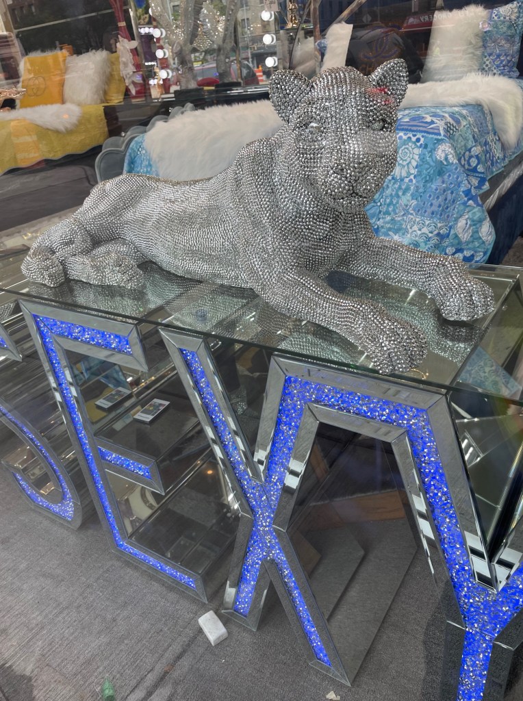 Soft fuzzy throws, a platform bed, sparkly lettering on overdrive, and a superconfident sequined jaguar. You can get it all on layaway. Maybe I could trade in the Murphy bed.