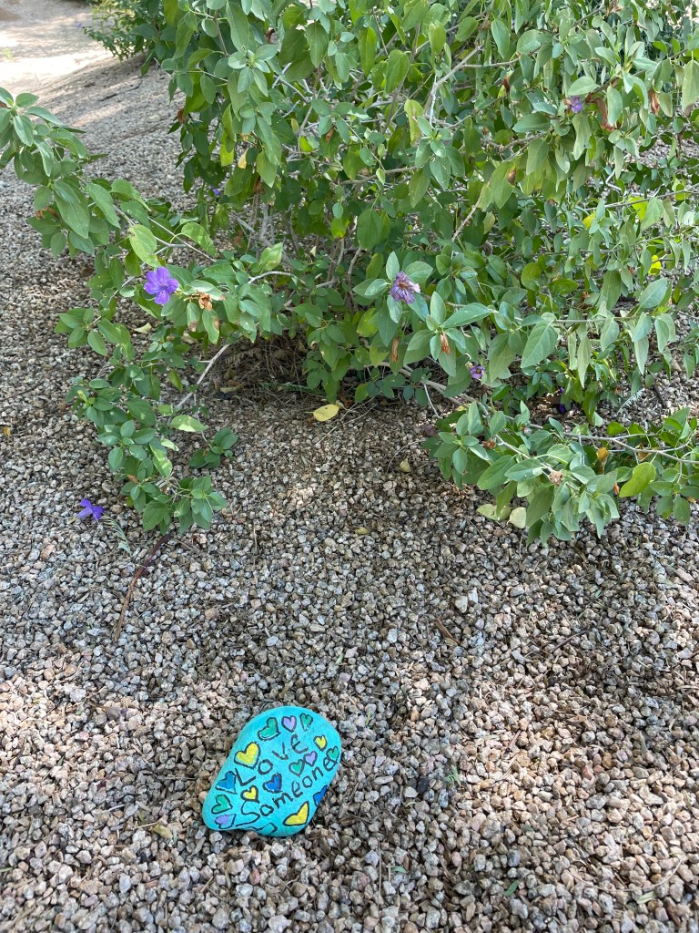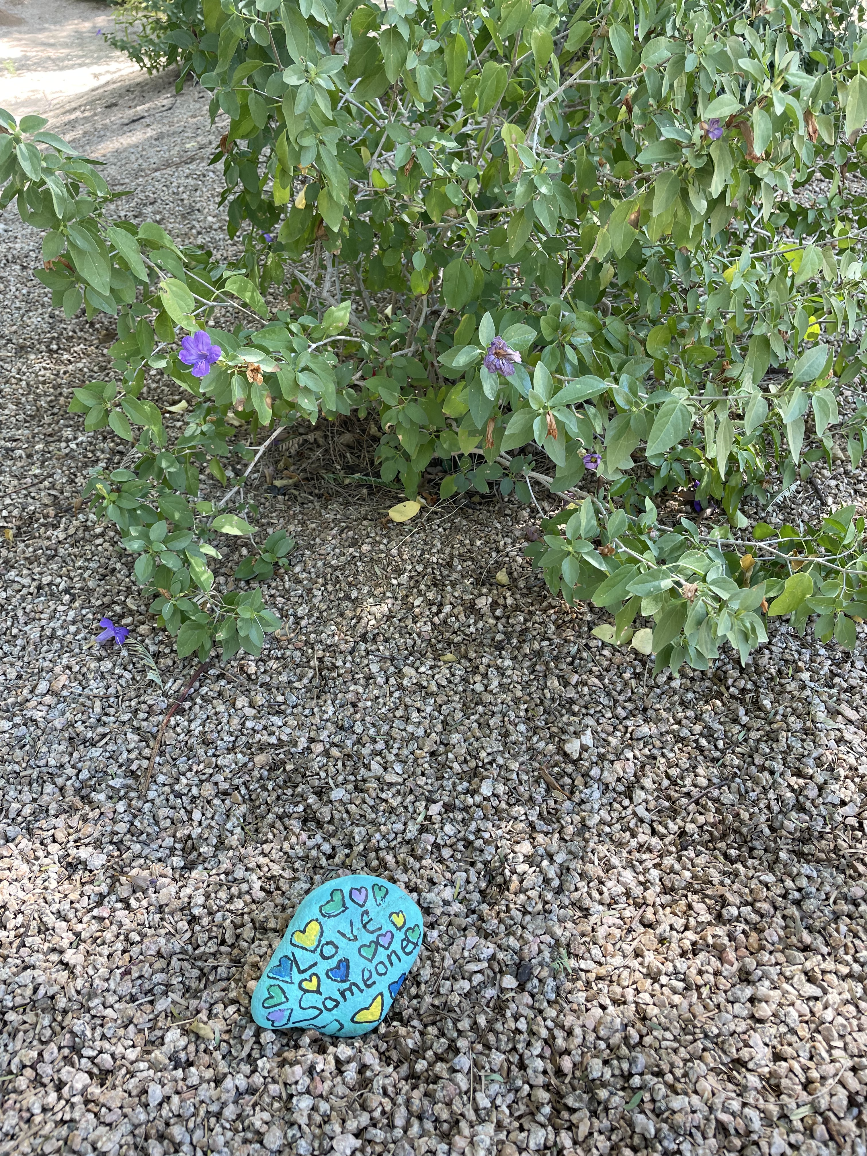 Someone has thought to leave slogan-painted stones among the desert plants. A little corny, but somehow fitting.