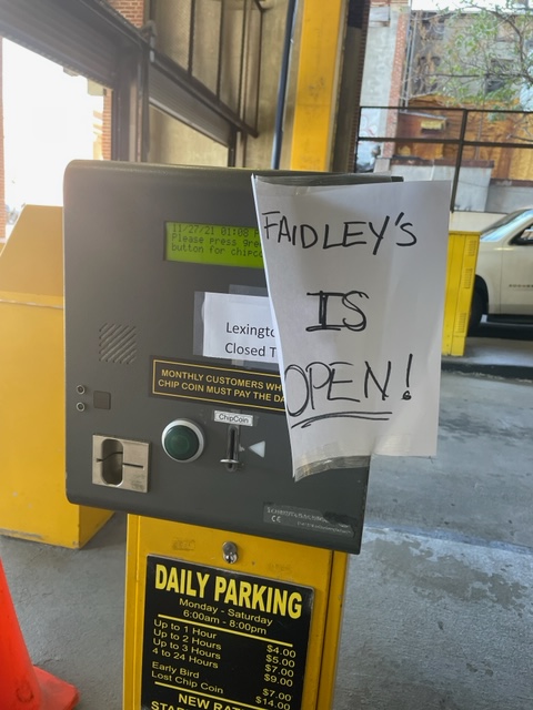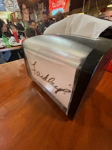 The rest of the Lexington Market in downtown Baltimore is shuttered, being reconstructed (a Covid casualty?). Only Faidley’s has managed to remain open. In the ladie’s room, the metal paper holder is bolted to the wall.