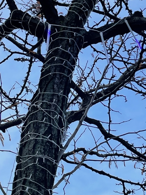 Newfangled Christmas lights, glowing purple day as well as night, entwining the honey locust right by where I park my car. Thank you, Four Brothers Discount!