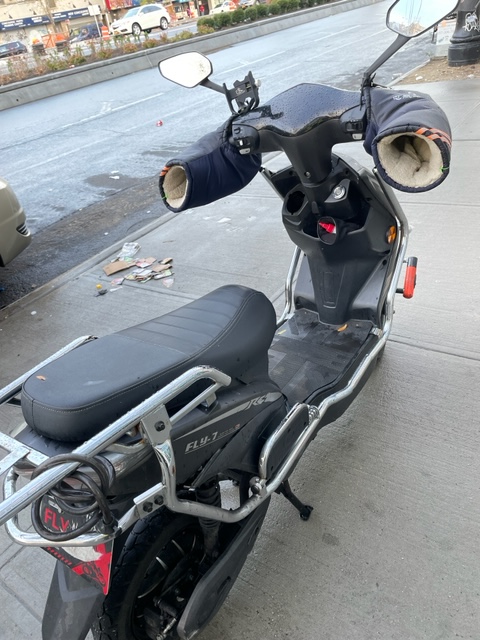 A fine new scooter (just the sight of it a torment to me since I crashed on an e-bike in August) sports a nifty add-on – custom mittens to keep a rider toasty.
