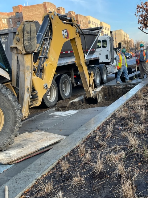 Behold, fresh-dug and filled tree pits! Young trees will arrive soon for planting.