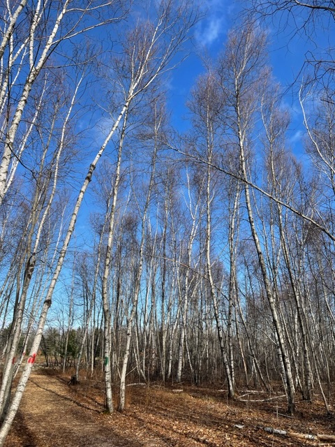 A stand of paper birch, in Maine, with the cold air all around. No lovelier place exists.
