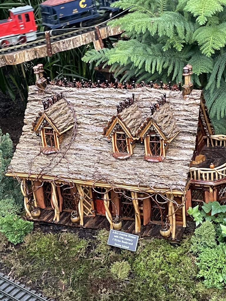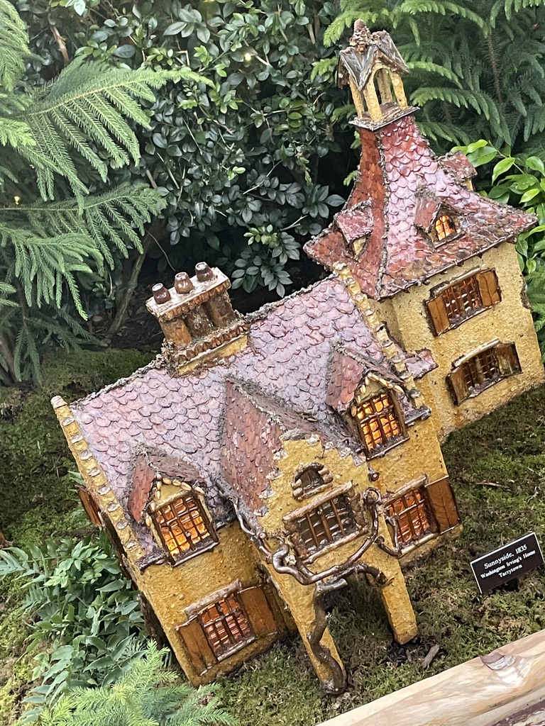Sunnyside, Washington Irving’s cottage in Tarrytown and dating to the 1830s, has muscled its way in. I have heard it said that the wisteria at the front doorway (reproduced here, albeit dully brown rather than deep purple) was the source of a quip by Irving himself, who said his nieces were afraid that the vine threatened to take over the whole estate. Interestingly, Irving mourned when the new long-distance train tracks materialized at the back of his property in 1847. In a letter he wrote to Gouvernor Kemble, he described being awoken at night by the “horrific sounds” and “constant calamity” of the train. I wonder what he would think of the toy train making its way past his model house to the delight of visitors in 2021.