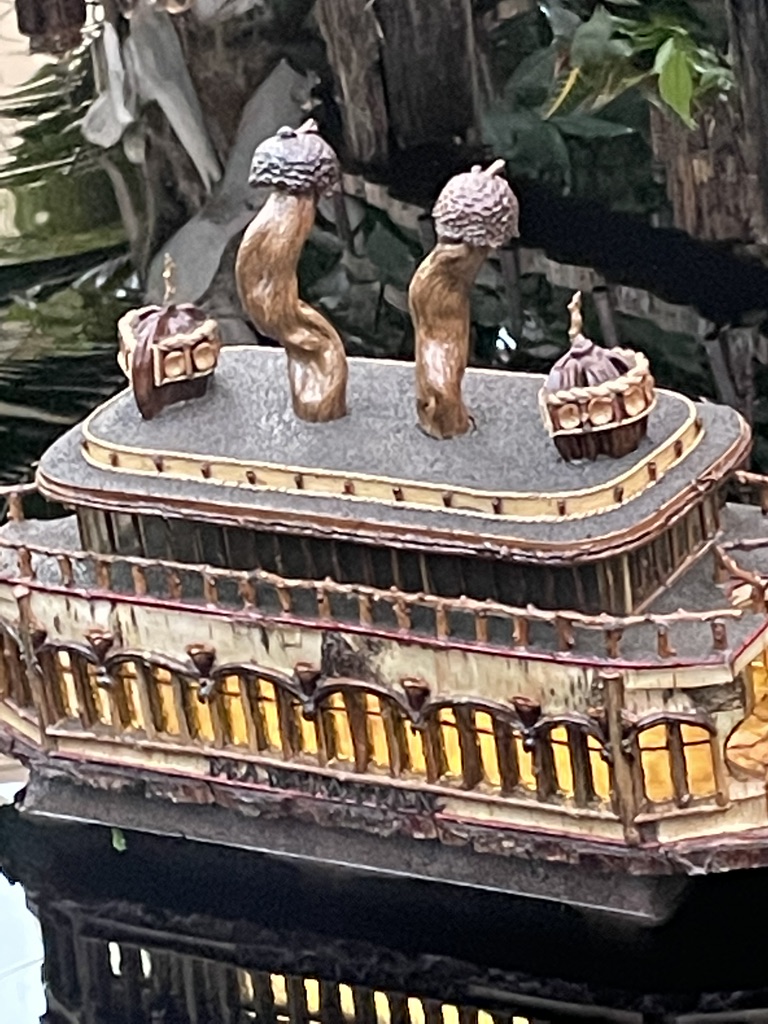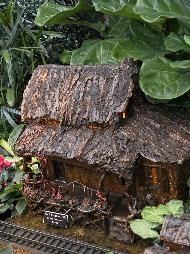 Sunnyside, Washington Irving’s cottage in Tarrytown and dating to the 1830s, has muscled its way in. I have heard it said that the wisteria at the front doorway (reproduced here, albeit dully brown rather than deep purple) was the source of a quip by Irving himself, who said his nieces were afraid that the vine threatened to take over the whole estate. Interestingly, Irving mourned when the new long-distance train tracks materialized at the back of his property in 1847. In a letter he wrote to Gouvernor Kemble, he described being awoken at night by the “horrific sounds” and “constant calamity” of the train. I wonder what he would think of the toy train making its way past his model house to the delight of visitors in 2021.