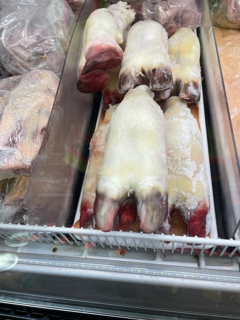 Cows’ feet the size of bowling pins in a butcher case.
