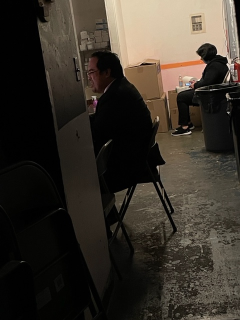 I was waiting for the bathroom and listening to a conversation in the office next to me behind some black curtains. Inside, surely another Banksy.