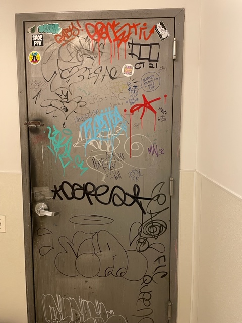 The inside of the bathroom door was of course an homage to graffiti, which Banksy loves.