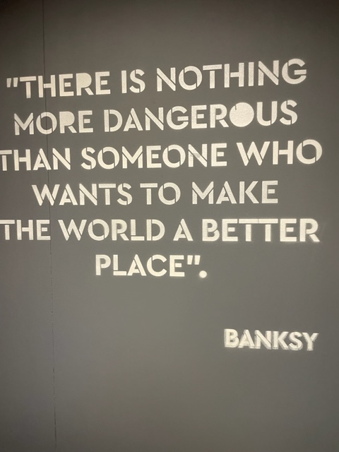 Playfully snarky and unapologetically political, Banksy is, as I said, an enigma. Going out,I asked the coatcheck girl if his identity had been somehow revealed in the show. “He’s very mysterious,” she said mysteriously. “I highly doubt it.”