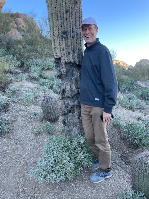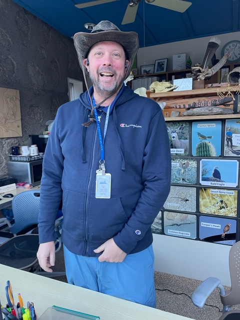 Wayne opened the window at the visitor center to answer my question about the blackened saguaros.