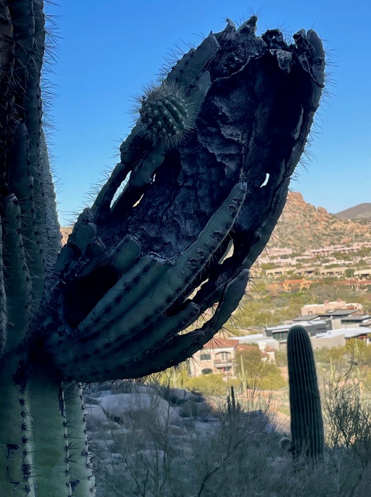 Some of the saguaros appeared charred, girdled, as if they had been torched by lightning.