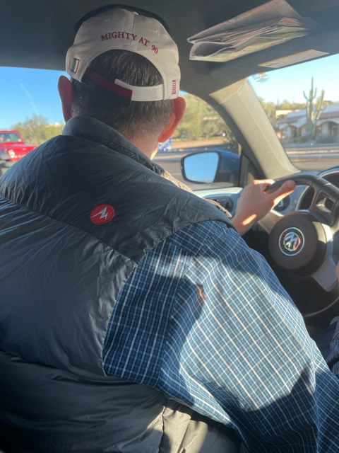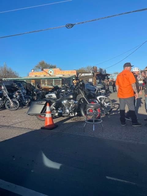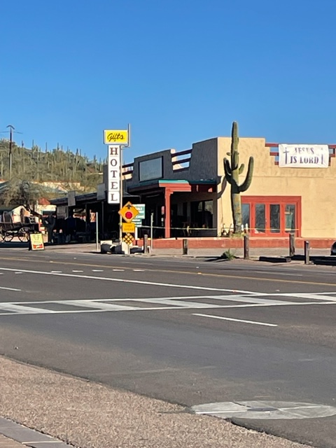 We pass groves of beaver tail or elephant tongue cactus, no one knows which. Cave Creek’s a tacky western-style town, replete with Jesus, gifts and cheap hotels. Big Earl’s Greasy Eats is the local fast food.