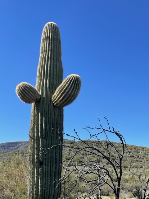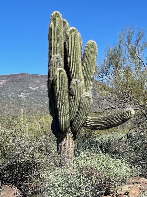 Sometimes you see a saguaro that took protection as it grew under a larger plant, one quite different from itself.
