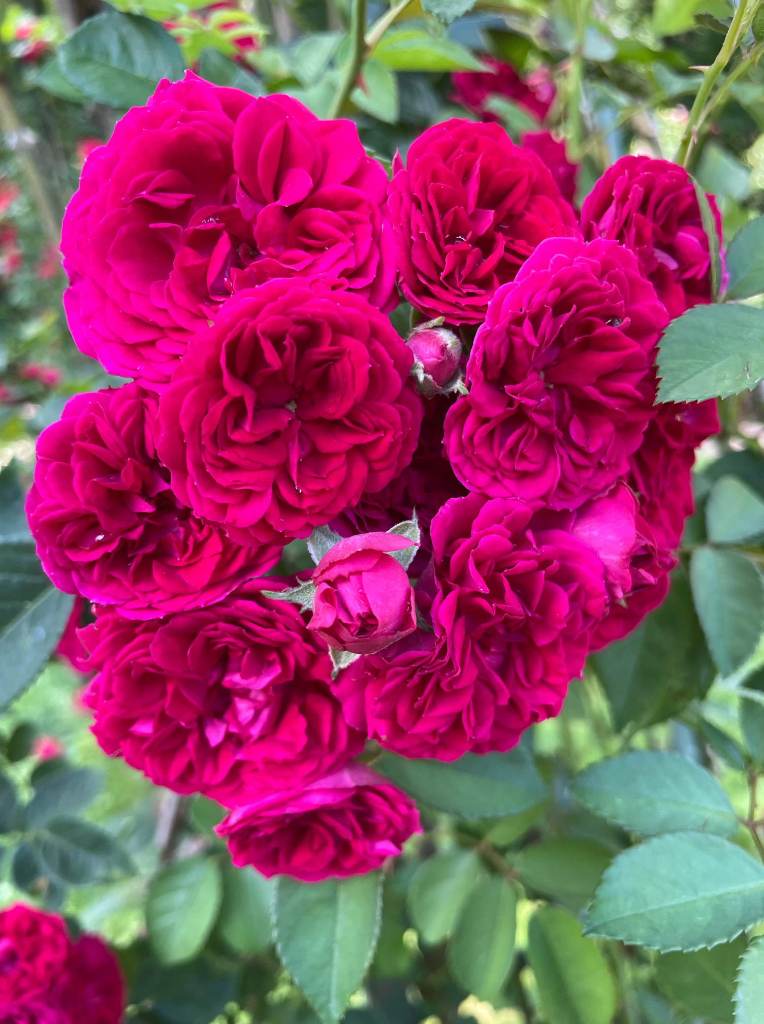 It’s a special flower, dating back to 1868, described in the rose literature as a vigorous climbing Bourbon rose with masses of highly fragrant, semi-double, carmine flowers, 3 in. across (8 cm), counting up to 30 petals. Born on thornless, purplish stems.