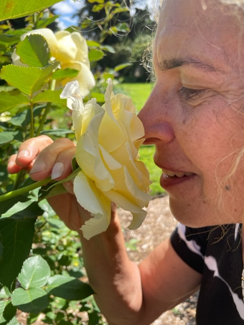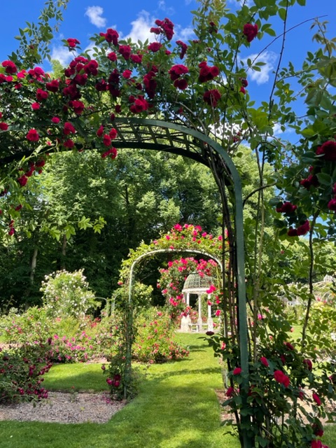 The thing to do if it is available to you (as they say in yoga class, referring to your ability to hold a pose) is to simply wander about a rose garden like the one at the Lyndhurst Estate and, yes, stop and smell the roses. We are so fortunate to have this magical place within walking distance.