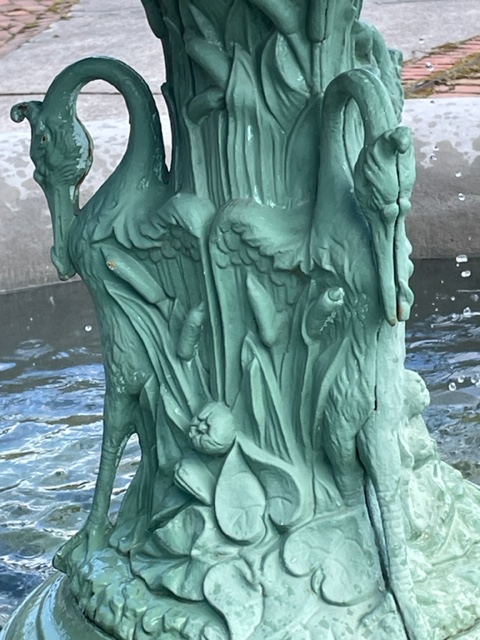 Okay. But an original fountain in the center bubbles, its bowl upheld by… pelicans perhaps? Or some mythological creature with bird feet?