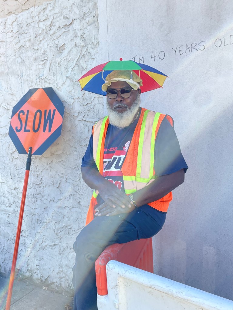A breezy day in Queens. Anthony the flagger on a well-deserved break: It ain’t a hard hat, but it keeps off the sun. Not a day over 40, indeed.