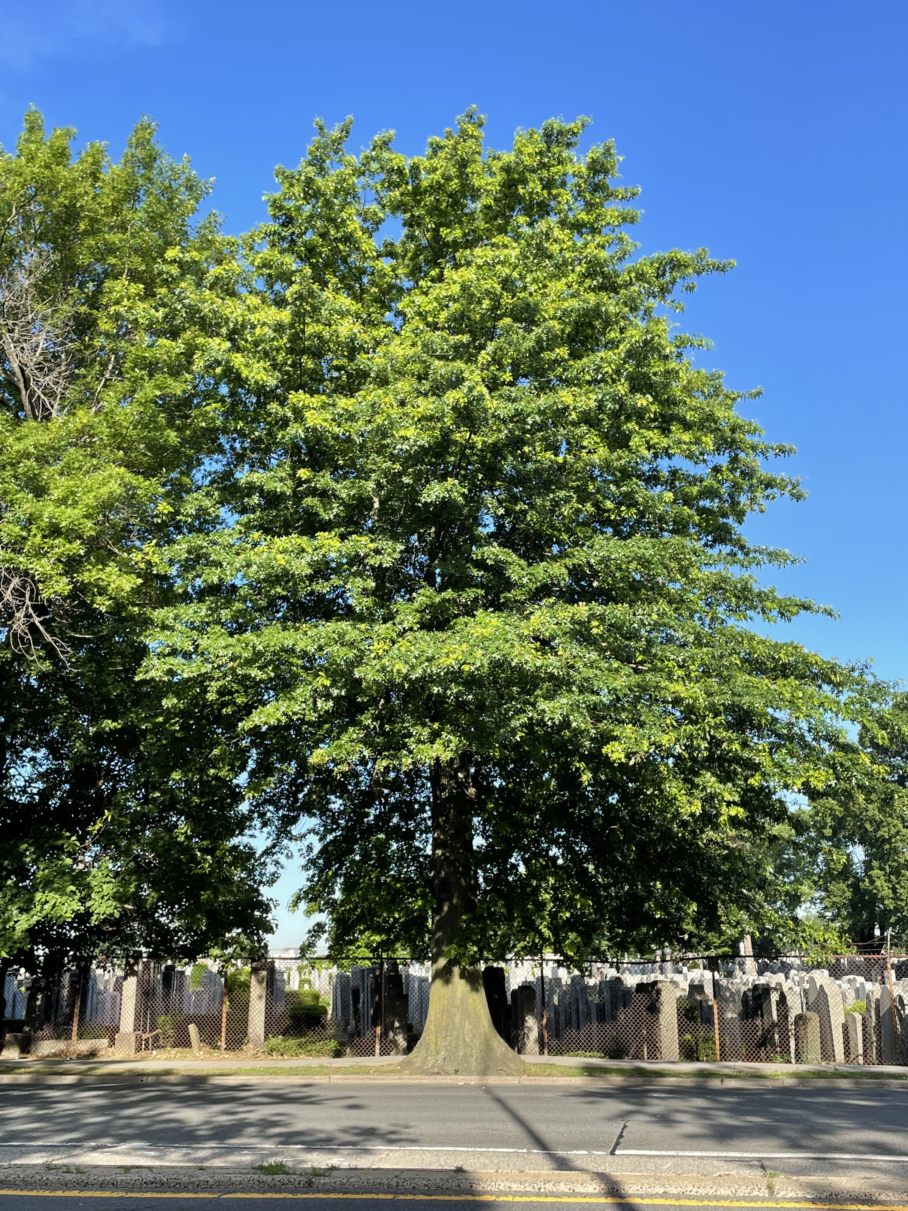The tree has a unique habit – its branches hold up the sky at the top, stick out straight as a t square in the middle and droop a bit at the bottom of its shape. There is a monster of a pin oak square in the middle of this sprawling burial ground.