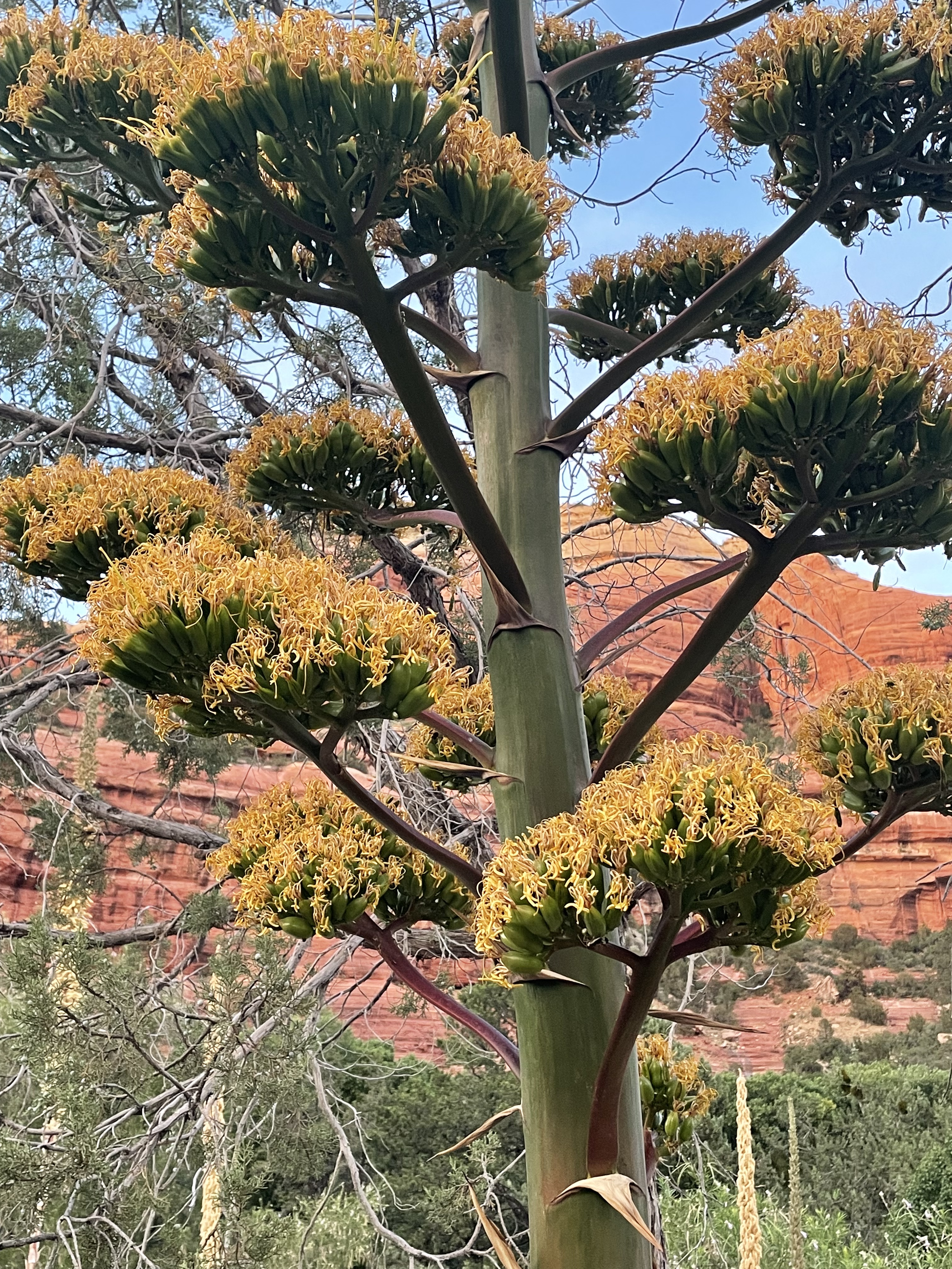 The century plant—which contrary to the old wive’s tale actually blooms after 10 to 30 years, at the end of its life —busts out its brawny blooms. By the way, is there anything wrong with the tales of old wives? Speaking as one, I think we are usually correct.