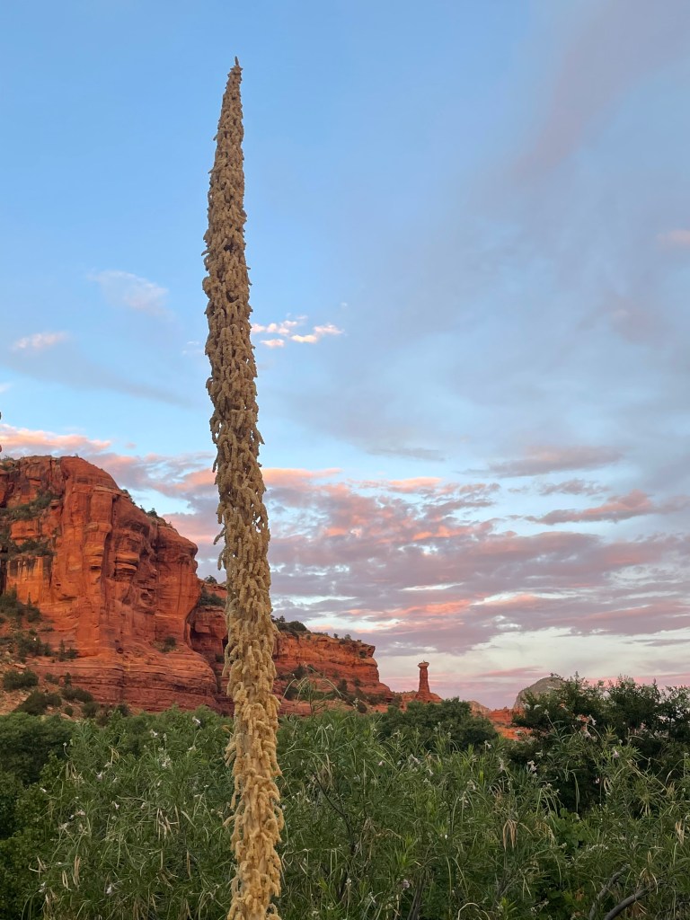 Once upon a time, the base of a cooked sotol stem was eaten much like an artichoke leaf (by scraping across the front teeth). What is left, called a quid, resembles a spoon and can be used as one. Archaeological sites feature samples of “Desert Spoon” thousands of years old. Sotol flower-stalks used as atlatl dart hind-shafts have been discovered in ceremonial caves, while the sotol stem was used as a fireplow. Just now, a fantastic dusk sentinel.