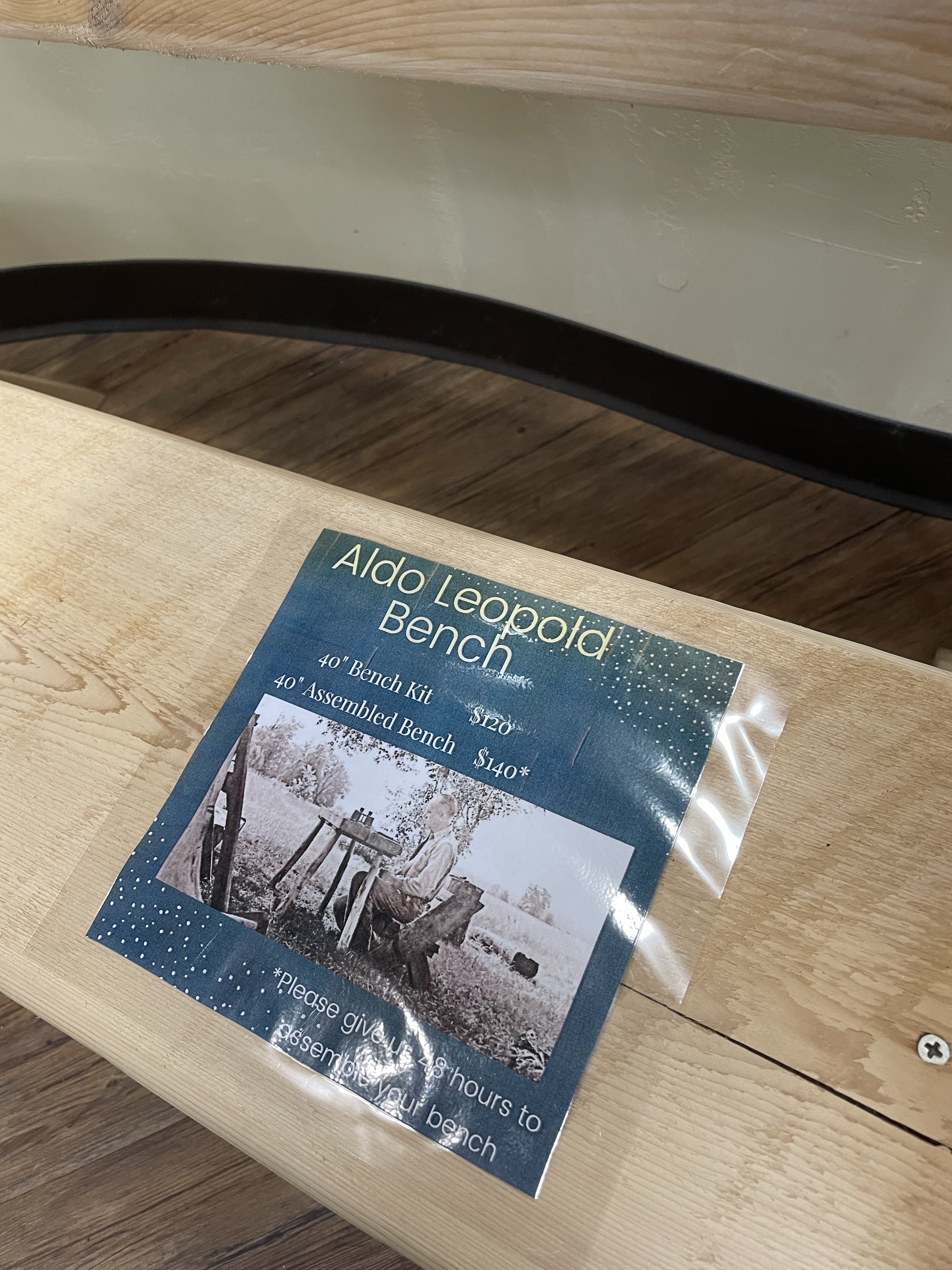 Aldo Leopold bench kit at The Ridges nature center at Bailey’s Harbor – 120 bucks will get conservation-minded carpenters the great naturalist’s name brand for their garden.