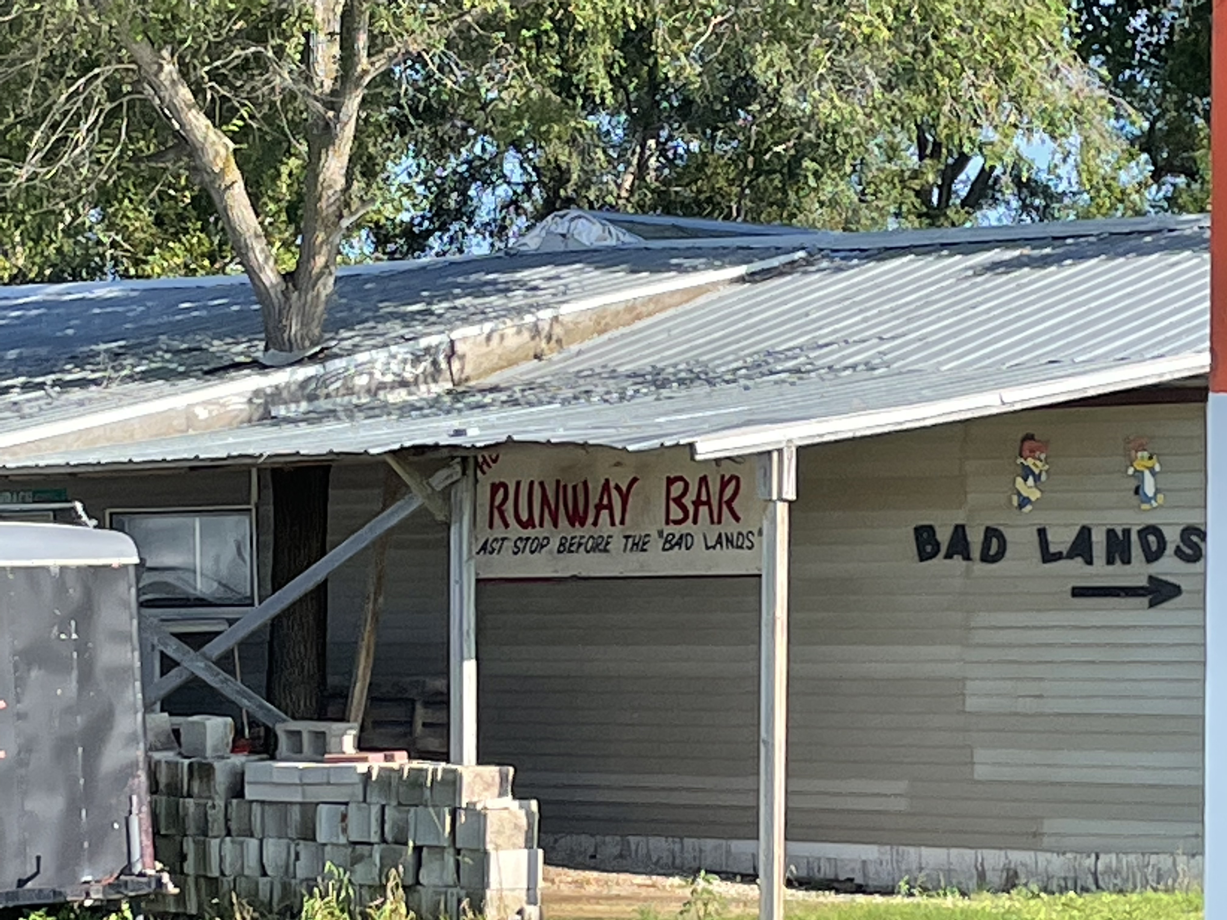 The Runway Bar in Door County at the small airport for private planes, Bad Lands in the back (bordello?), shut down in the ‘90s but still offering a side-of-the-road sight for sore eyes, tree busting through the roof and all. A dive bar that took a nose dive, says Gil.