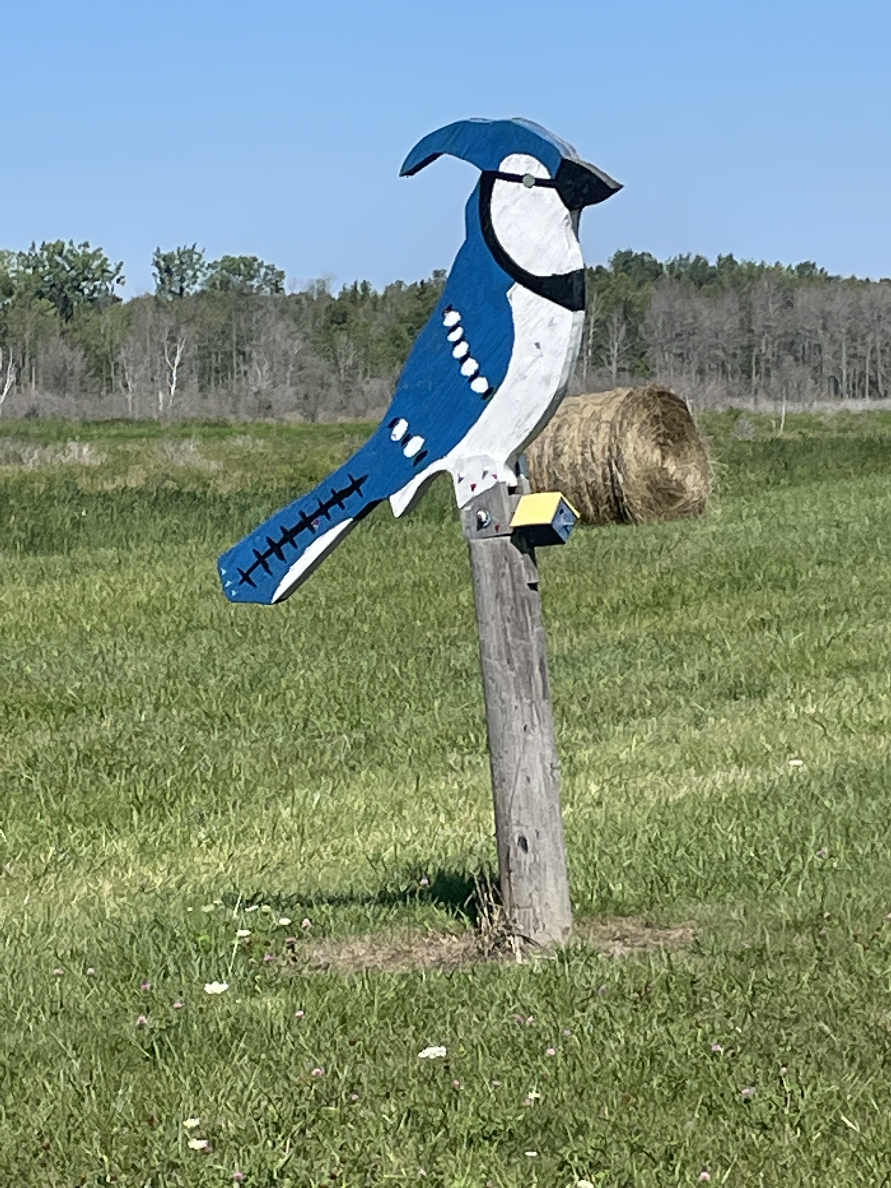 Earlier on our journey, another blue jay, by the road side. Good effort to whomever created it, and good tidings to all travelers passing by.