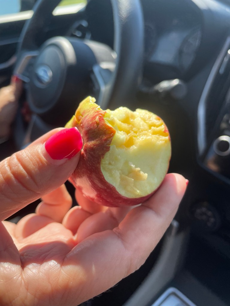 Apple plucked from the grass beneath an old-old tree, the kind of fruit people used to go crazy for in the days before candy for everybody all the time – mainly sour, cottony, with skin of leather, instantly oxidizing – which I ate down to the core before tossing out the window.