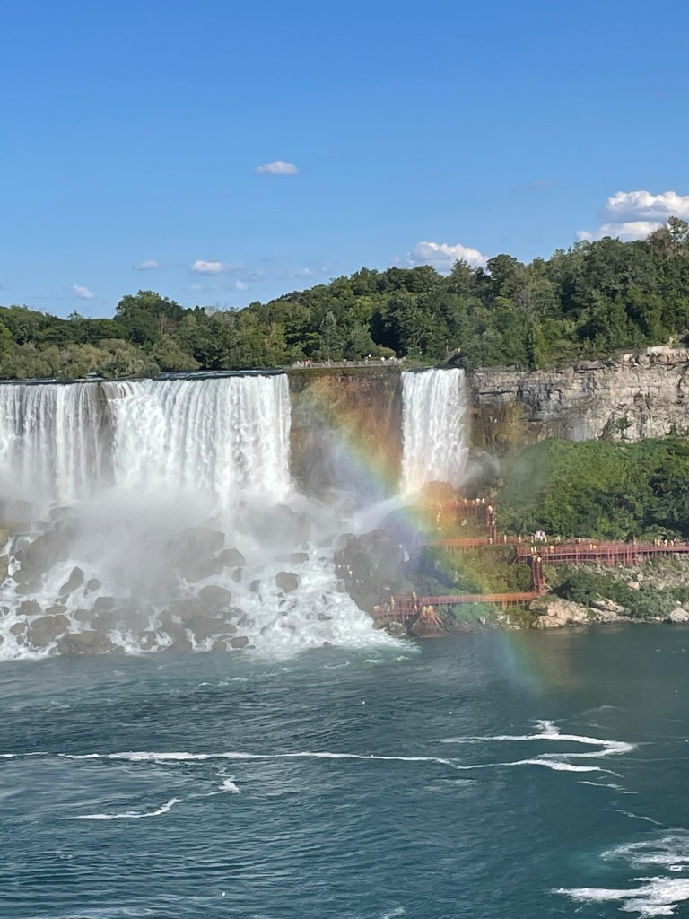 A rainbow, always a good harbinger, this time at what is called the American Falls at Niagara. Eschewing the yellow ponchos they give out to tourists who stop under the torrent, I looked down over the whole scene and was impressed by a) the majesty, of course and b) the tawdriness of the surroundings. Have three quarters of all commercial establishments (hotels, restaurants, etc.) shut down during the pandemic, or does it just seem that way?