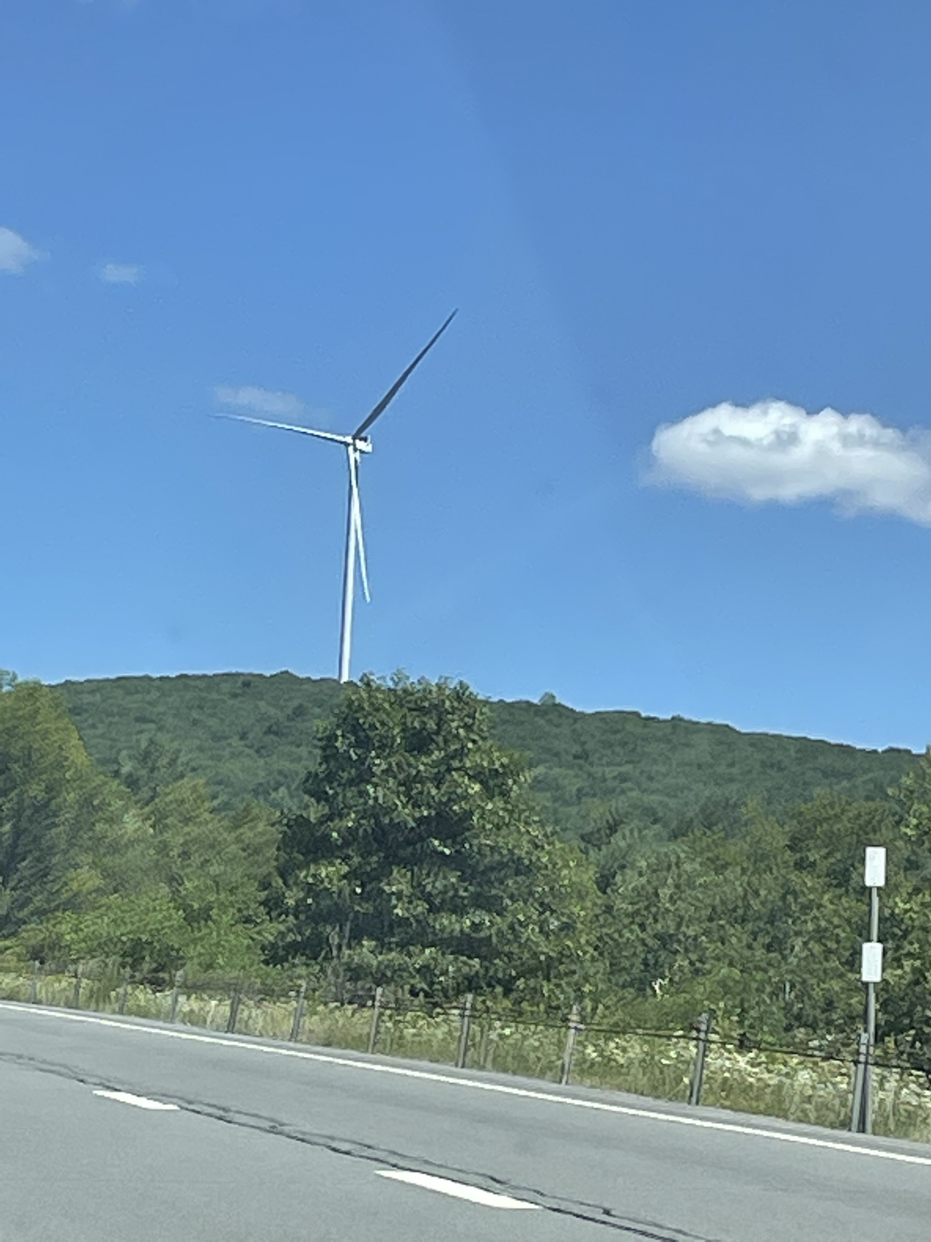 Sleek windmills all along the highway. I’m told not by Cervantes not to tilt at them — they might be evil giants — but I insist. Saw some on the road being transported, accompanied by a robust police convoy.