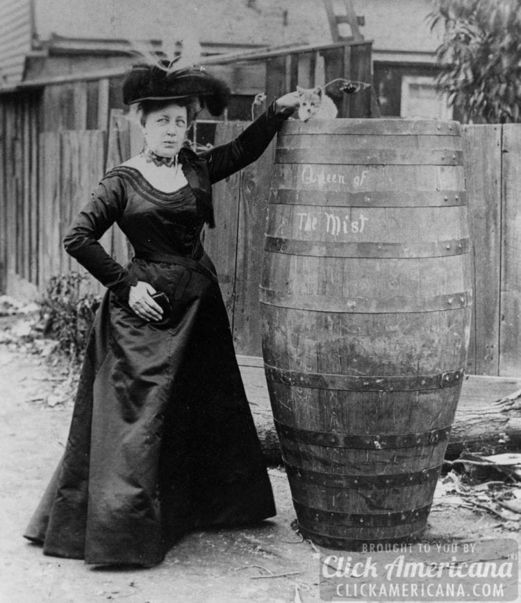 Apparently her only monument stands in Oakwood Cemetery in Niagara Falls, where she died as a public charge – only 17 minutes of fame for her and no gold at the end of the rainbow (bad manager blamed). A schoolteacher, she fitted herself out in barrel weighted down with a 100-pound anvil and went for the ride of her life, only getting slightly banged up.