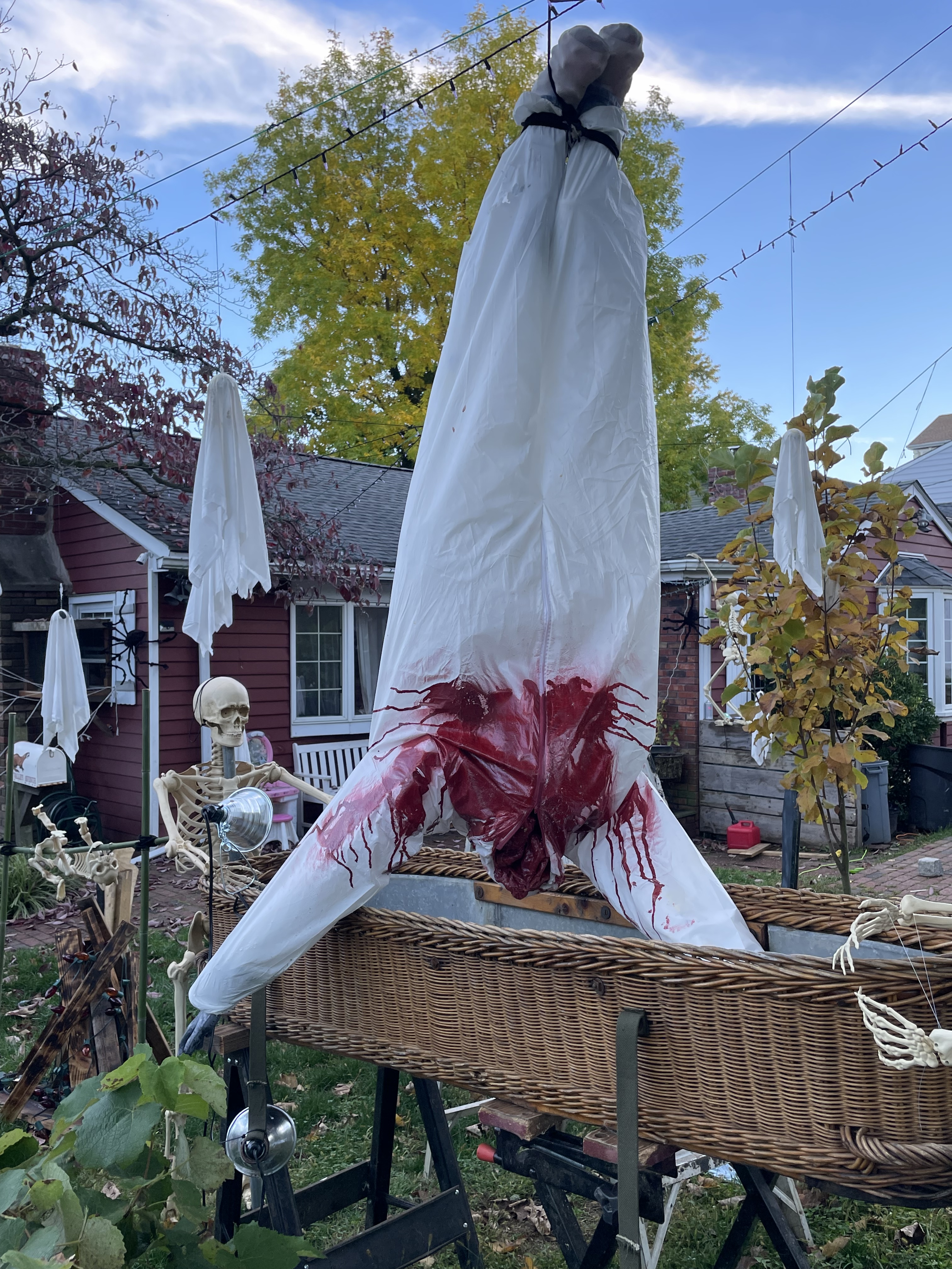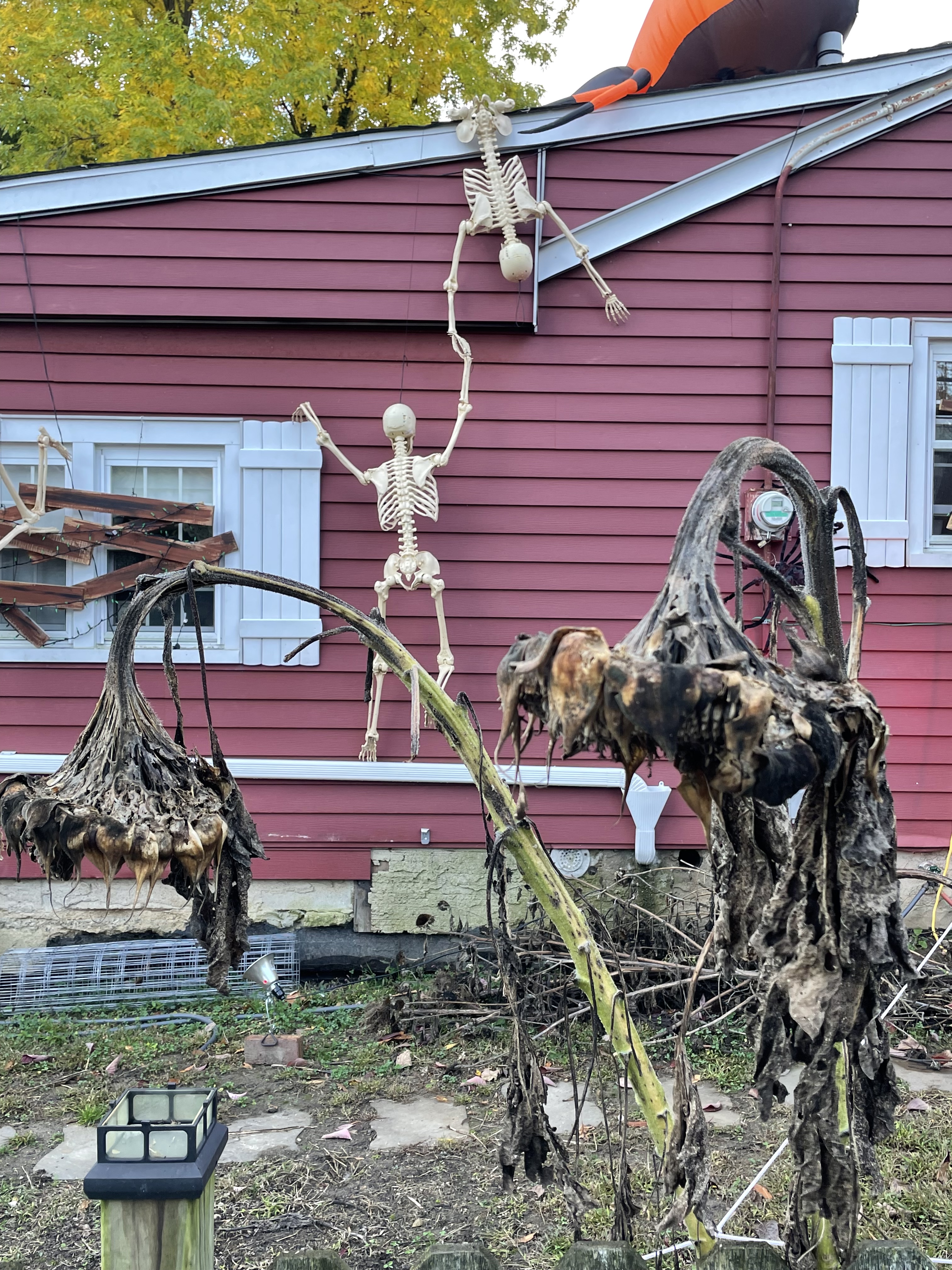 Everything but the kitchen sink. Dead flowers of the season. Boarded up windows a nice touch.