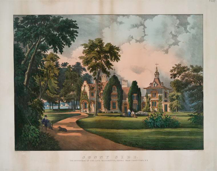 Irving made his home at Sunnyside, his wisteria-covered 1830s “snuggery” on the east bank of the Hudson. His nieces, he said, were afraid that the vine threatened to take over the whole estate. From the veranda you could see the sun set over the Palisades. When the new long-distance north-south train tracks materialized at the back of his property in 1847, he fumed, complaining about being awoken at night by the “constant calamity” of the train.