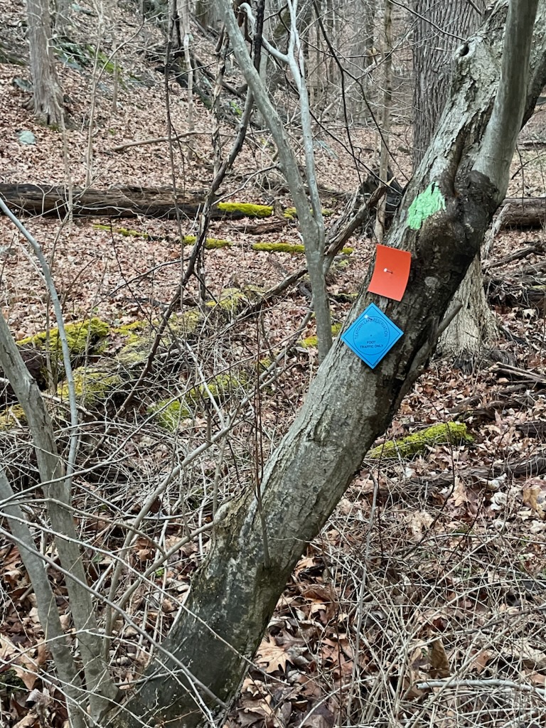 It’s cultivated woods here, not forest. The fifteen miles of trails have been well tagged, in every color of the rainbow, practically.