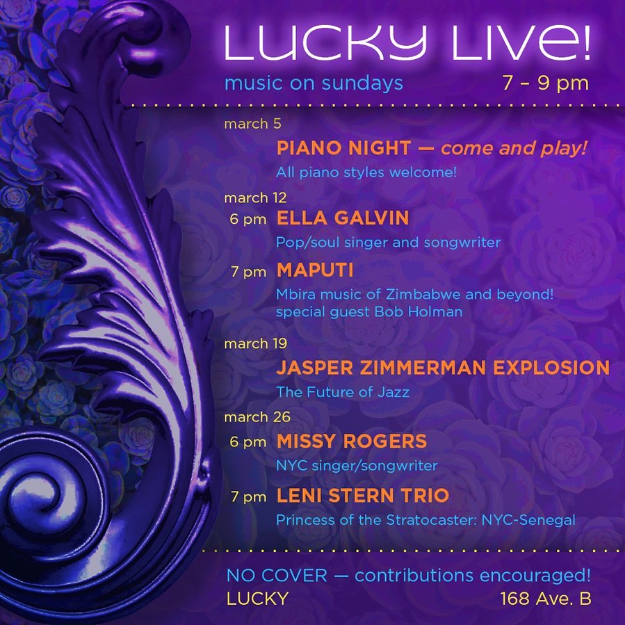 The Jasper Zimmerman Explosion appeared at the intimate establishment a couple of nights ago. No cover. No minimum. Just lots of cool. Lucky’s on Avenue B, after all.