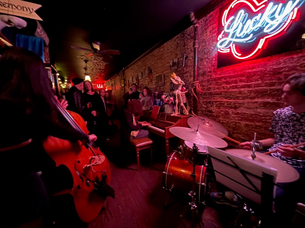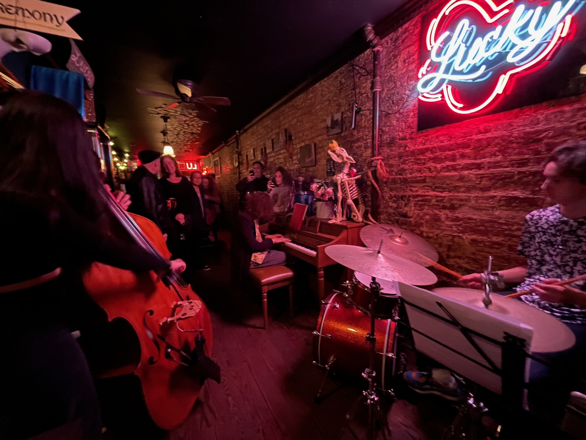 About the venue: Since Lucky was such a small space (we could hardly fit the bass and drums!), and the piano was just a little upright, I didn’t expect much of the acoustics. However, the piano, bass, and drums all cut through and I was told that people in the back could hear us clearly. Playing at Lucky reminded me of the bygone days of New York jazz, where musicians performed in dive bars similar to it.