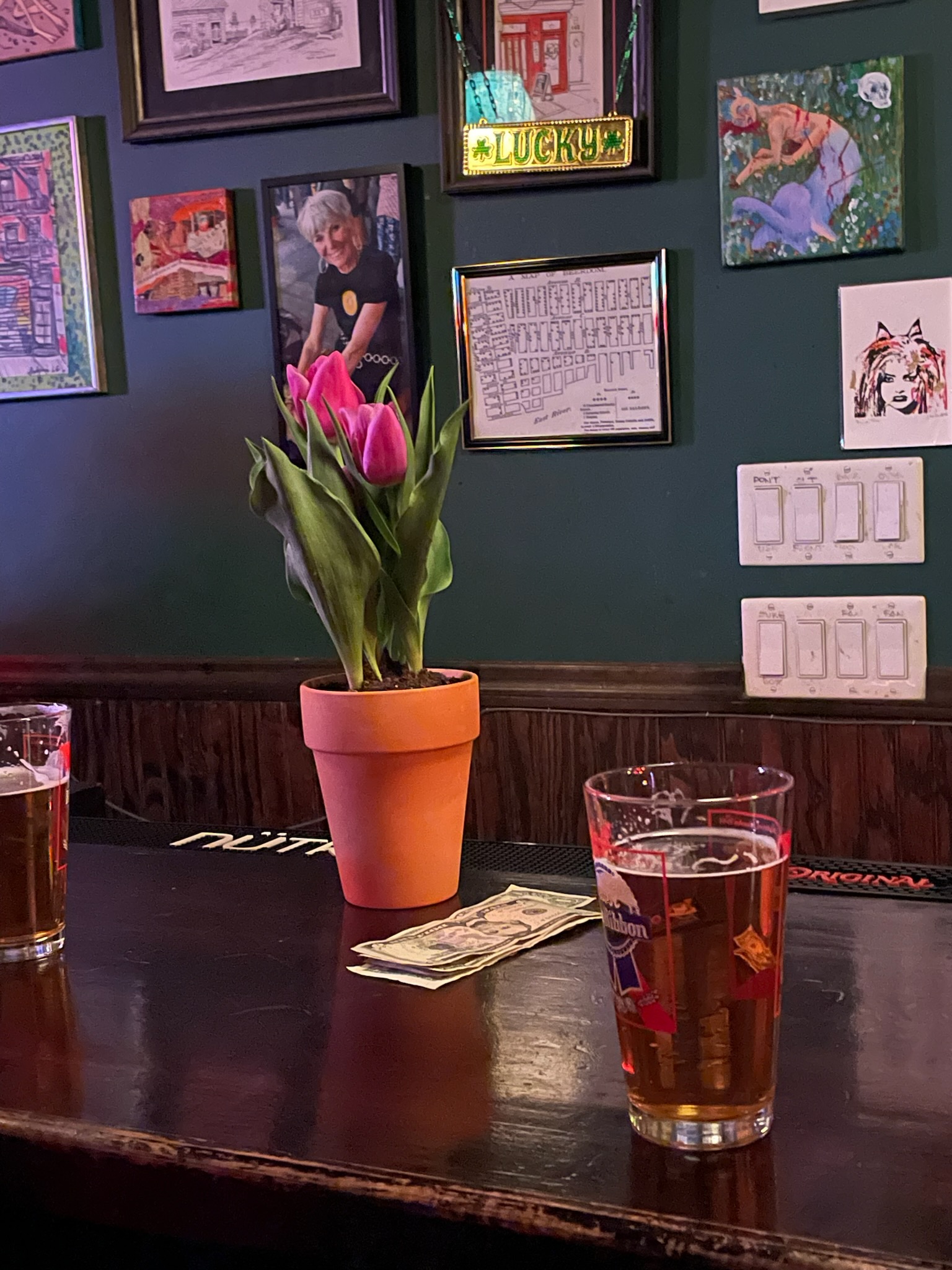Lucky had held a vernal equinox celebration earlier in the day, so everyone was gussied up and had a happy afterglow. Spring flowers bloomed on the bar.