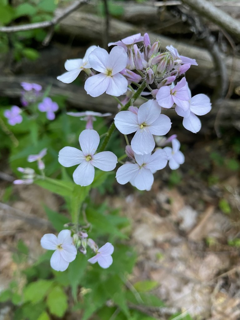 You can tell it is Dame’s rocket because it has four petals, putting it in the mustard family. Same family as Garlic mustard.